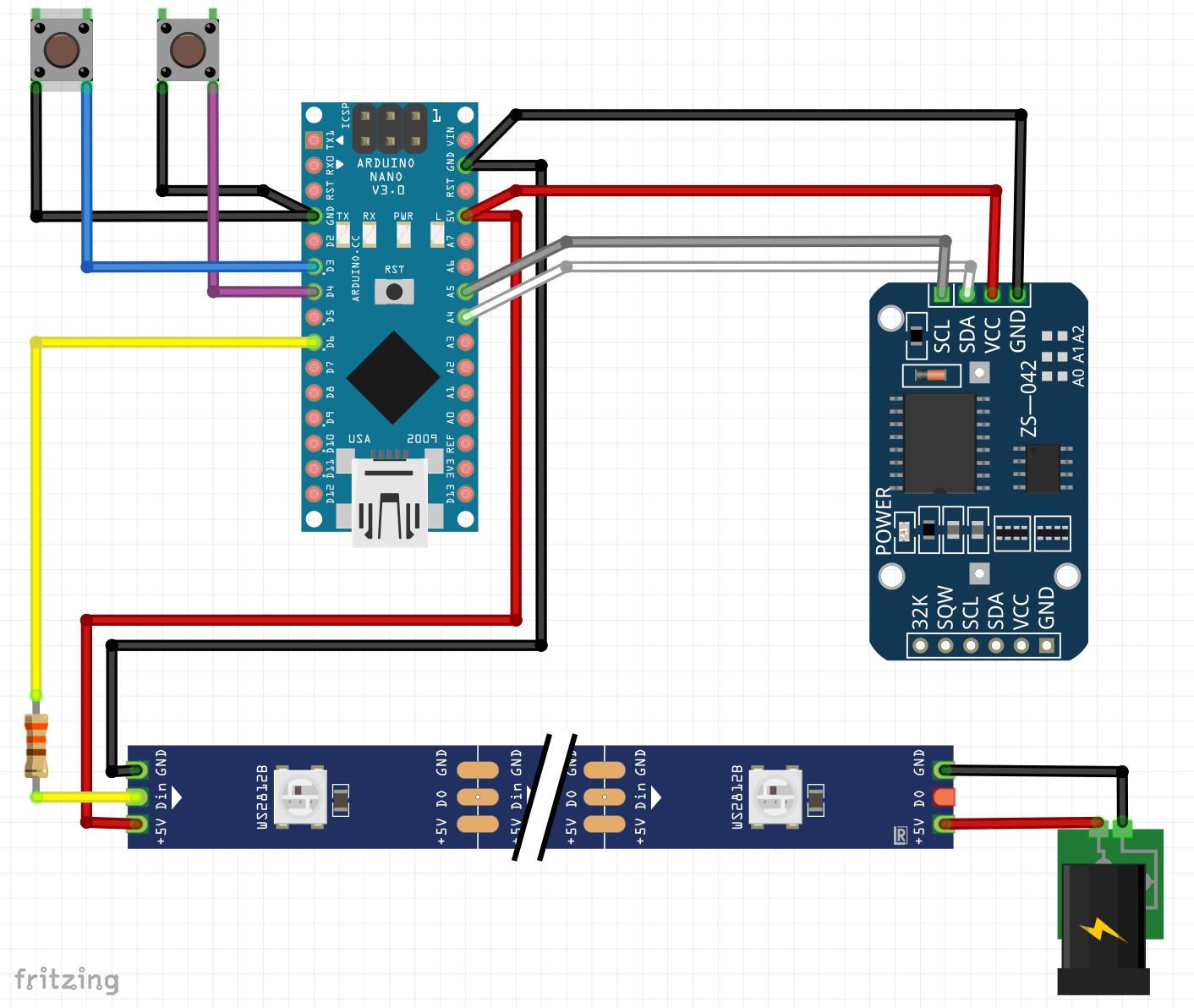 - Connect two buttons to Arduino - D3 (blue), D4 (purple), GND