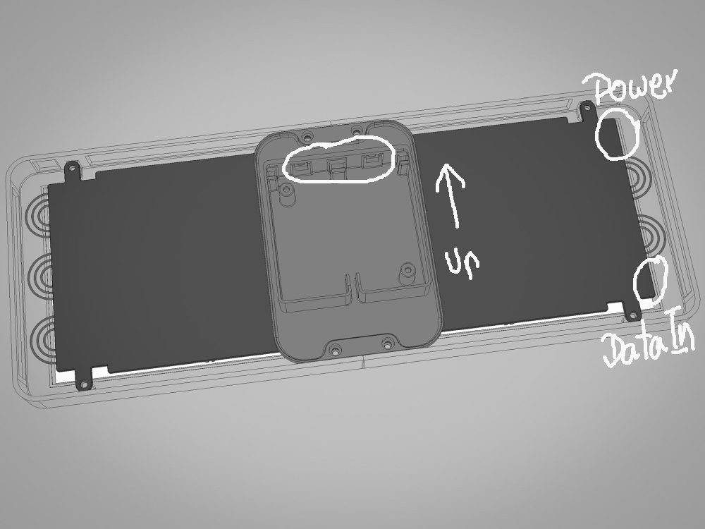 - Connect wires for Arduino to bottom left corner (data in, +5v, gnd)